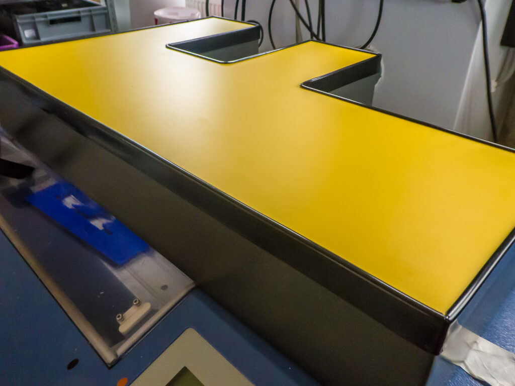 Das ist oft für viele der Knackpunkt. Deckel und Boden brauchen eben die Form von Buchstabe, Logo oder Grafik. Mit einer Fräse und/oder einem Laser kein Problem. Hat man die Möglichkeiten nicht, kann man immer auf einen Dienstleister zurückgreifen. Die benötigten Materialien sind Standard und überall zu bekommen. Auch kurzfristig. Nach Info von Lieferanten ist es sogar weit verbreitet die nötigen Rohlinge mit der Stichsäge zu fertigen. Hört sich erst mal an wie Heimwerken. ist aber gar nicht so. Eine gute Stichsäge gehört zur Mindestausstattung in der Werbetechnik. Und man kann damit genau und schnell arbeiten. Die fertigungsbedingten Ungereimtheiten verschwinden am Ende im Umleimer oder bei den Böden in der Kleberbaht. Was für wen eine sinnvolle Option ist entscheidet sicher auch die Fingerfertigkeit. Eine wirklich perfekte Alternative ist die Shaper Origin. Eine handgeführte CNC Fräse. Kann man nicht erklären, muss man sehen.